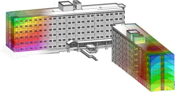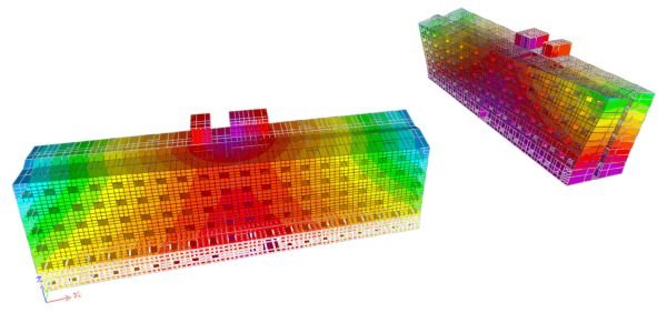 Composite image I created combining a stress diagram from an FEM model I developed overlaid on the Revit Structural model I created. 私が開発した FEM モデルの応力図を、私が作成した Revit 構造モデルに重ねて組み合わせて作成した複合画像。