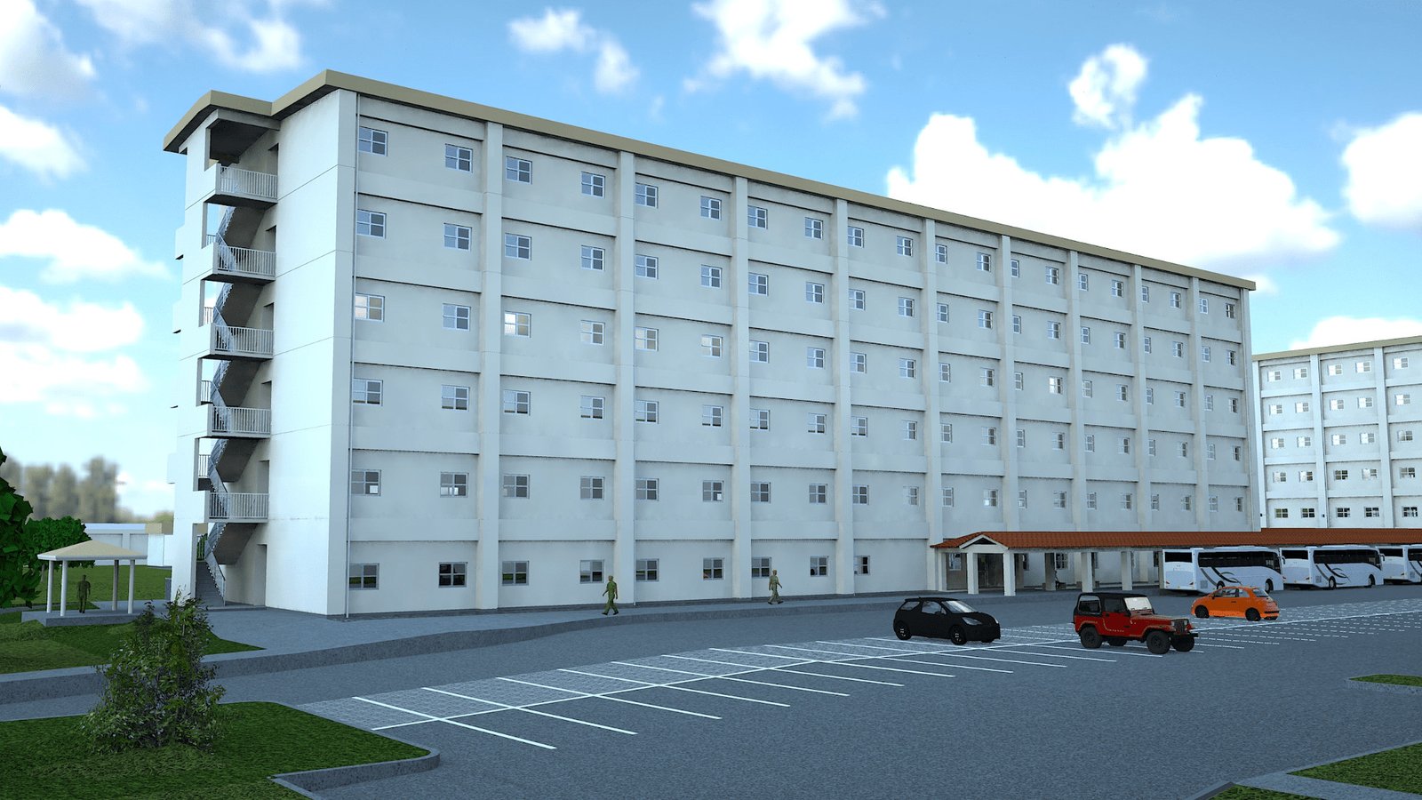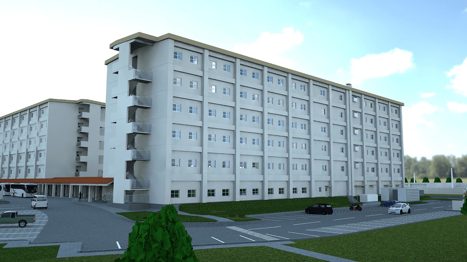 Renderings of two six-story concrete buildings I recently designed in Okinawa. 私が最近沖縄で設計した 6 階建てのコンクリート建物 2 棟のレンダリング図。
